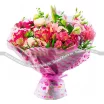 лилия розовая -  1 шт, альстромерия розовая - 3 шт, эустома розовая - 3 шт, эустома белая  -  1 шт, декоративная зелень, фетр розовый. Примерный диаметр букета 20х20см.