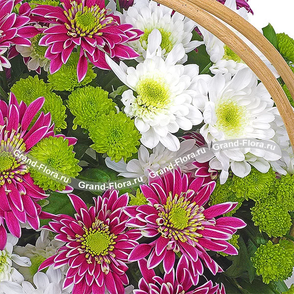 Волшебная корзинка с нежными хризантемами создаст романтичное настроение. Чудесная декоративная бабочка на ручке является стильным дополнением этого флористического шедевра. Сочетание белых, фиолетовых и зеленых оттенков делают корзинку отличным подарком к любому поводу — будь это признание в любви или знак внимания для дорогой мамы. Корзинка украсит интерьер и будет долго радовать вас своим изысканным видом.
