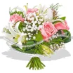 Уменьшенный: роза розовая - 3 шт, лилия белая - 1 шт, гипсофила - 1 шт, аспарагус - 1 шт, декоративная зелень, лист аспидистры загнутый - 3 шт, сетка белая. Примерный диаметр букета 25х25 см.