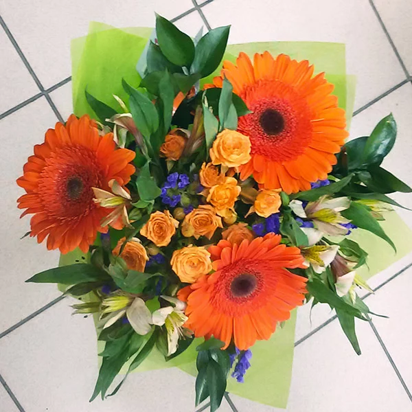 гербера оранжевая - 3 шт, роза кустовая оранжевая - 2 шт, альстромерия оранжевая - 3 шт, статица фиолетовая - 2 шт, рускус,фетр зеленый.