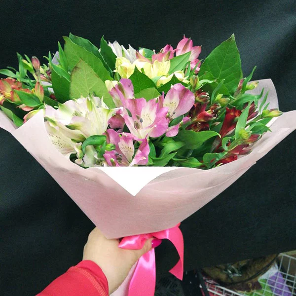 ДЕЛЮКС: эустома розовая - 6 шт., эустома фиолетовая - 6 шт., эустома белая - 5 шт., альстромерия розовая - 11 шт., альстромерия белая - 5 шт.,фетр светло-фиолетовый.