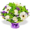 роза белая - 15 шт, гербера белая - 9 шт, хризантема кустовая зеленая - 10 шт, статица - 7 шт, салал, фетр из двух слоев - зеленый и фиолетовый, лента. Примерный размер: 45Х45 см.