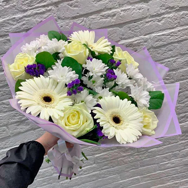 Стандартный (на фото):  роза белая - 5 шт, гербера белая - 3 шт, хризантема кустовая зеленая - 3 шт, статица - 2 шт,салал, фетр из двух слоев - зеленый и фиолетовый, лента. Примерный размер: 25Х25 см.