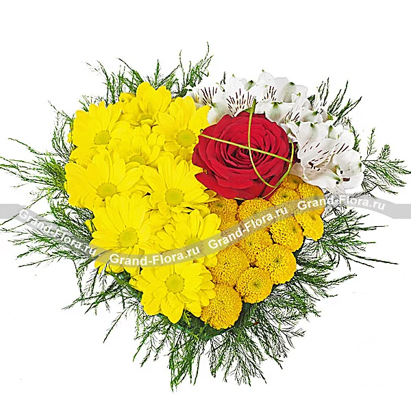 Стандартный (на фото): хризантема кустовая ромашковая (желтая) - 2 шт., хризантема кустовая сантини (желтая) - 2 шт., роза красная - 1 шт., альстромерия белая - 1 шт., аспарагус - 1 шт., оазис сердце.
