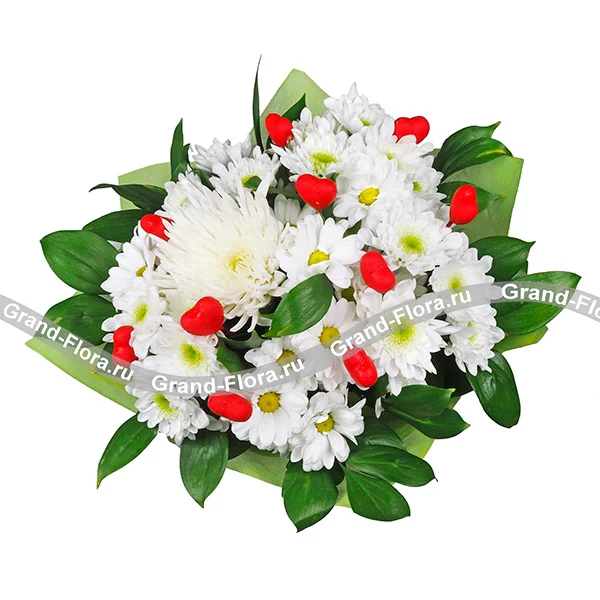 * Обратите внимание: на фото декор в виде сердечек,  в случае отсутствия - возможна замена на гиперикум красный, лагурус или красные колоски.
