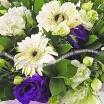 Уменьшенный: гербера белая - 3 шт., эустома белая - 2 шт., эустома фиолетовая - 2 шт.,  рускус, фетр фиолетовый, бант фиолетовый.