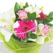 Уменьшенный: роза розовая (аква) - 3 шт., гербера малиновая - 2 шт., лилия белая - 1 шт., рускус, сетка зеленая. Примерный диаметр букета 40х40 см.
