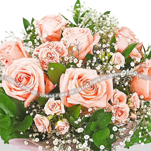 ДЕЛЮКС: роза розовая - 15 шт., роза кустовая розовая - 10 шт., гипсофила - 6 шт., рускус, фетр розовый, бант розовый. Примерный диаметр букета 50х50 см.
