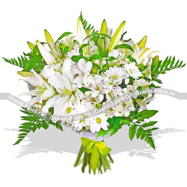 Стандартный: лилия белая - 2 шт., хризантема белая кустовая - 3 шт., альстромерия белая - 2 шт., декоративная зелень, фетр белый, бант зеленый.