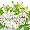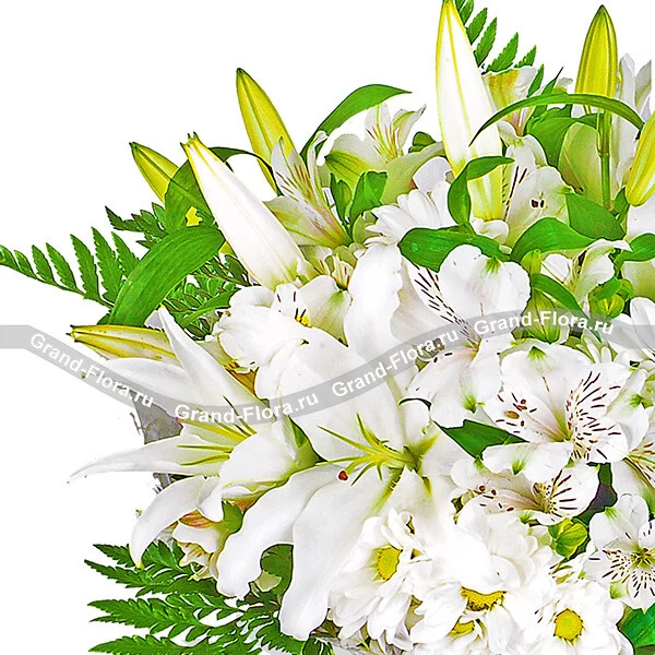 ЛЮКС: лилия белая - 3 шт., хризантема белая кустовая - 5 шт., альстромерия белая - 4 шт., декоративная зелень, фетр белый, бант зеленый.