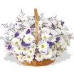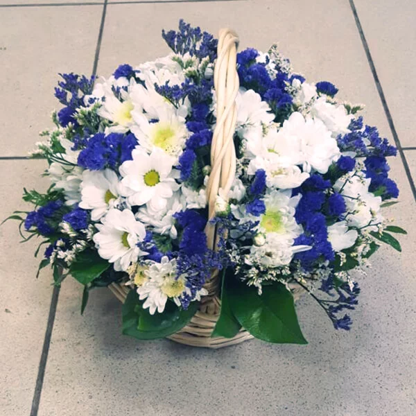 Уменьшенный: хризантема белая кустовая ромашковидная - 5 шт., статица - 3 шт., декоративная зелень, оазис, корзина малая.