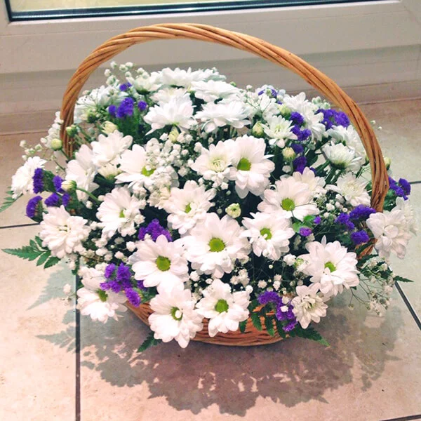 Букет из хрупких цветов, помещенный в плетеную корзинку, является не только чрезвычайно привлекательным, но и оригинальным презентом. Изящные белоснежные хризантемы подойдут к любому торжеству, будь то свадьба друзей, юбилей или день рождения любимой девушки. Также букет станет великолепным решением для вручения маме или сестре на 8 марта.