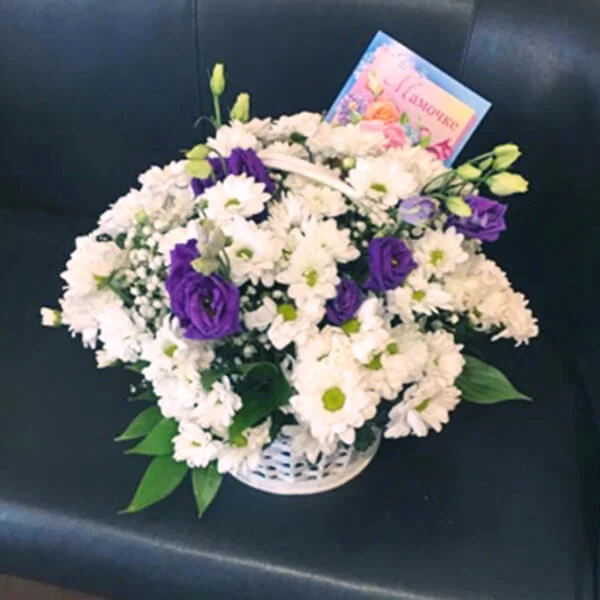 Стандартный: хризантема белая кустовая ромашковидная - 9 шт., статица - 4 шт., декоративная зелень, оазис, корзина средняя.