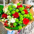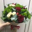 Уменьшенный: роза красная - 2 шт., роза кустовая белая - 1шт., хризантема кустовая зелёная - 1 шт., аспидистра - 1 шт., эвкалипт - 1 шт., салал - 2 шт., гиперикум - 1 шт., упаковка крафт, лента. Примерный размер: 20Х20 см.