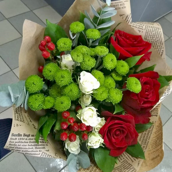 Люкс: роза красная - 5 шт., роза кустовая белая - 3 шт., хризантема кустовая зелёная 5 шт., аспидистра - 3 шт., эвкалипт - 2 шт., салал 2 шт., гиперикум - 3 шт., упаковка крафт, лента. Примерный размер: 35Х35 см.