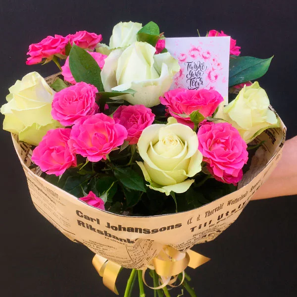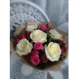 роза белая - 15 шт., роза кустовая розово-белая (возможна замена на розовую/малиновую) - 8 шт., декоративная зелень, упаковка крафт, лента кремовая. Примерный размер: 35Х35 см.