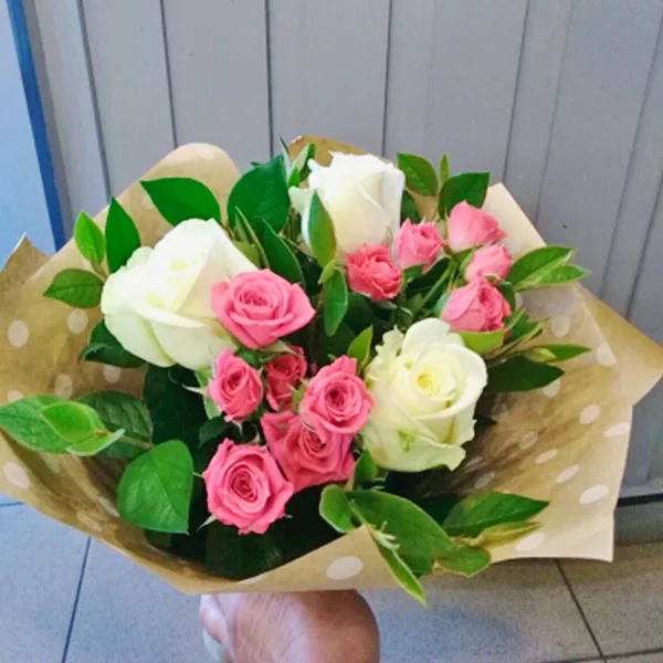 роза белая - 3 шт., роза кустовая розово-белая (возможна замена на розовую/малиновую) - 2 шт., декоративная зелень, упаковка крафт, лента кремовая. Примерный размер: 20Х20 см.