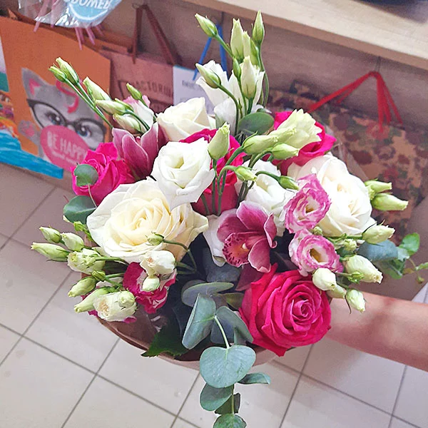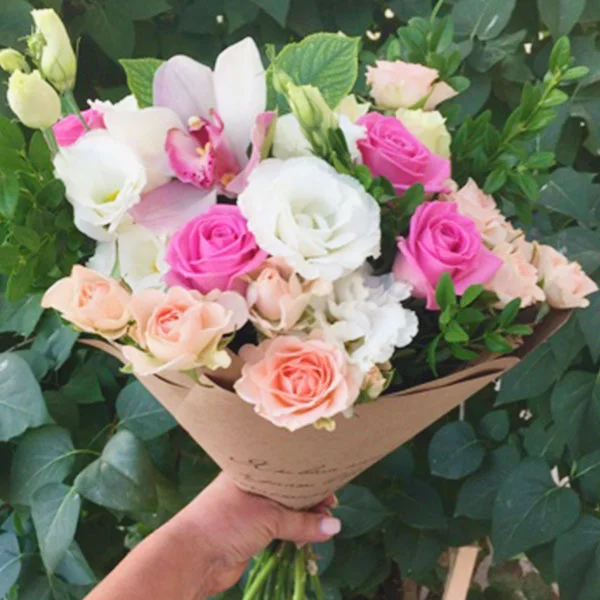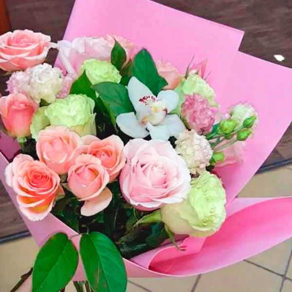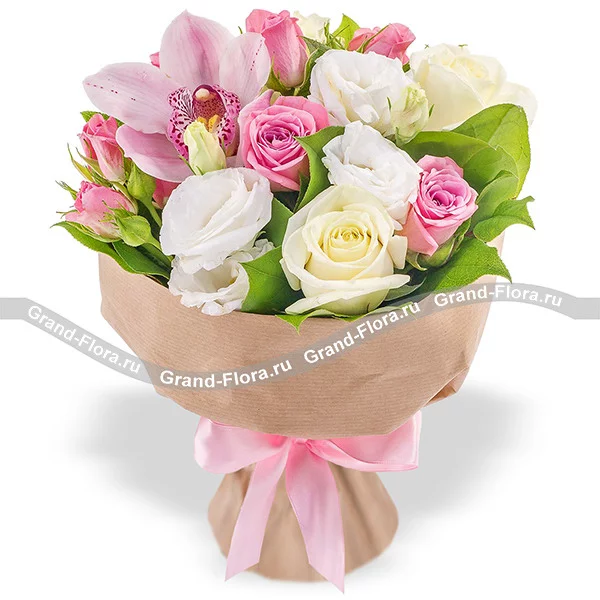 Букет составлен из роз белых оттенков сорта Мондиаль, розовых роз Ангажемент и кустовых роз розового цвета. Дополнена композиция белой эустомой и прекрасной розовой орхидеей, которая в давние времена,  считалась цветами аристократов, а окраски могли символизировать особое отношение: так розовая орхидея, используемая в композиции «говорит» о нежных чувствах. Довершает композицию декоративная зелень и стильная крафтовая упаковка, перевязанная лентой в тон цветов.