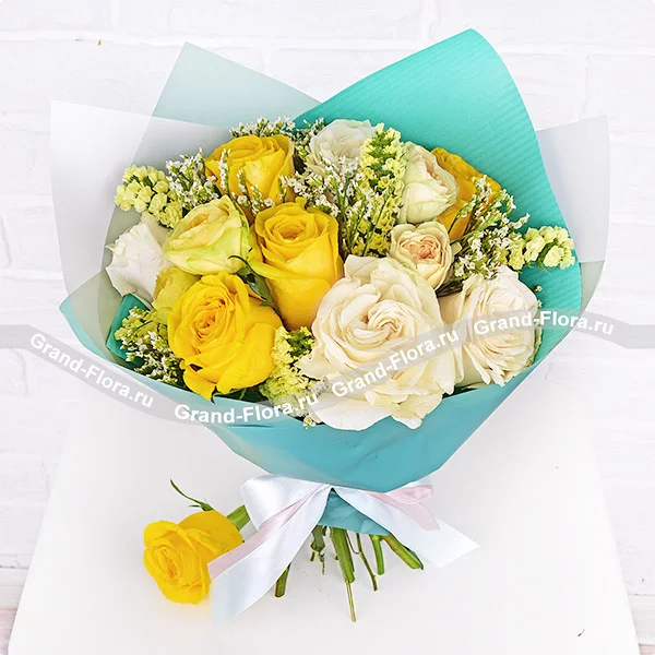 Стандартный: роза белая - 4 шт., роза желтая - 4 шт., роза кустовая желтая - 1 шт., роза кустовая белая - 2 шт., декоративная зелень, упаковка, лента. *Возможна замена кустовой розы на один оттенок (только белые или только желтые),декоративная зелень может отличаться от фото.