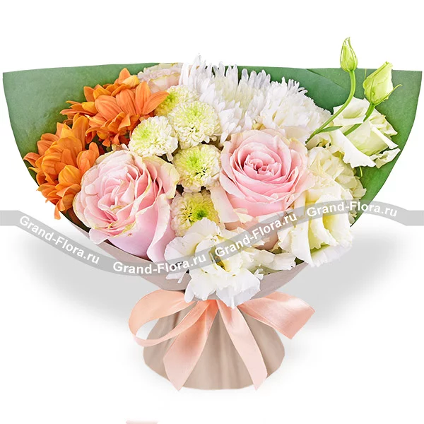 Стандартный: роза розовая - 4 шт., хризантема кустовая оранжевая - 2 шт., эустома белая - 2 шт., хризантема одноголовая белая - 2 шт., хризантема белая кустовая - 2 шт., гвоздика белая - 3 шт., упаковка, лента. Примерный размер: 35Х35 см.