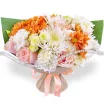 Уменьшенный: роза розовая - 3 шт., хризантема кустовая оранжевая - 1 шт., эустома белая - 1 шт., хризантема одноголовая белая - 1 шт., хризантема белая кустовая - 1 шт., гвоздика белая - 2 шт., упаковка, лента. Примерный размер: 25Х25 см.