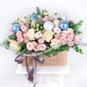 Стандартный(на фото): чай "Curtis"- 20 пак., конфеты "Ferrerro Roсher" - 269 г., лайм - 5 шт., лимон - 2 шт., шишки - 3 шт., шарики - 2 шт., корзина средняя.