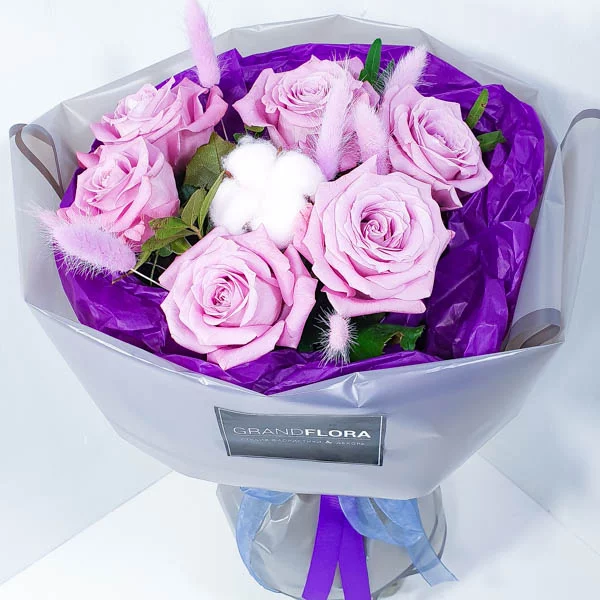 "Лиловое настроение" - это букет, который прекрасно подходит для подарка любимому человеку или для декора интерьера. Цветочная композиция состоит из роскошных сиреневых роз, которые прекрасно сочетаются с мягким и абсолютно нежным хлопком. Букет оформлен в яркой фиолетово-серой упаковке, которая добавляет ему дополнительную изюминку и стиль. Этот букет идеально подходит для любого праздника или специа