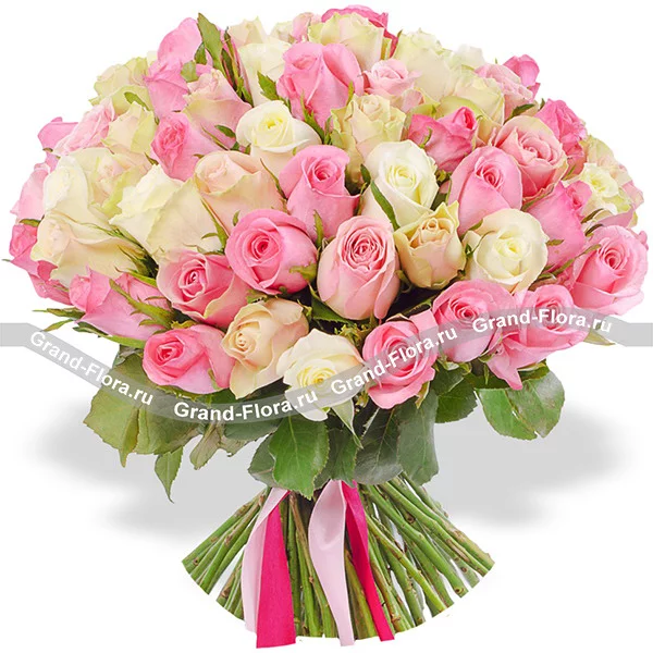 Роза белая (кремовая) и розовая 50 см - 49 шт , упаковка фетр.
