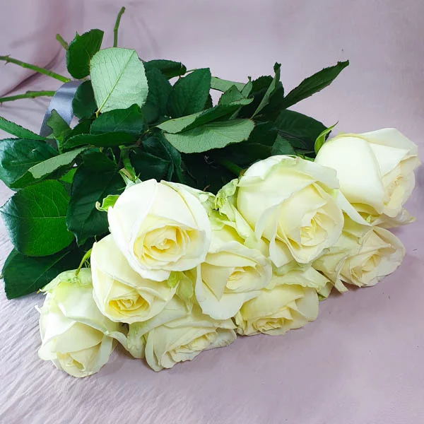 Роза белая 50 см - 9 шт, упаковка, лента.