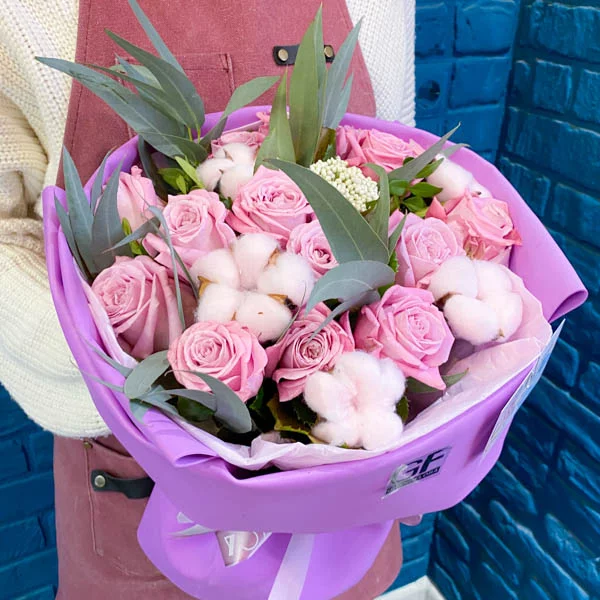 "Розы в этом букете излучают нежность и любовь, они символизируют чувства и идеально подходят для выражения признания или извинения. Сухой хлопок добавляет немного роскоши и элегантности, а декоративная зелень придает букету жизненную силу. Фиолетовая упаковка делает букет стильным и модным, идеально подходящим для любого праздника или события. 'Зефирные мечты' букет - это идеальный выбор для тех, кто хочет выразить свои чувства и подарить радость."