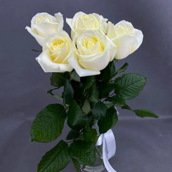 Роза белая (количество, выбранное Вами) 50-60 см, упаковка, лента. На фото представлен букет из 5 роз.